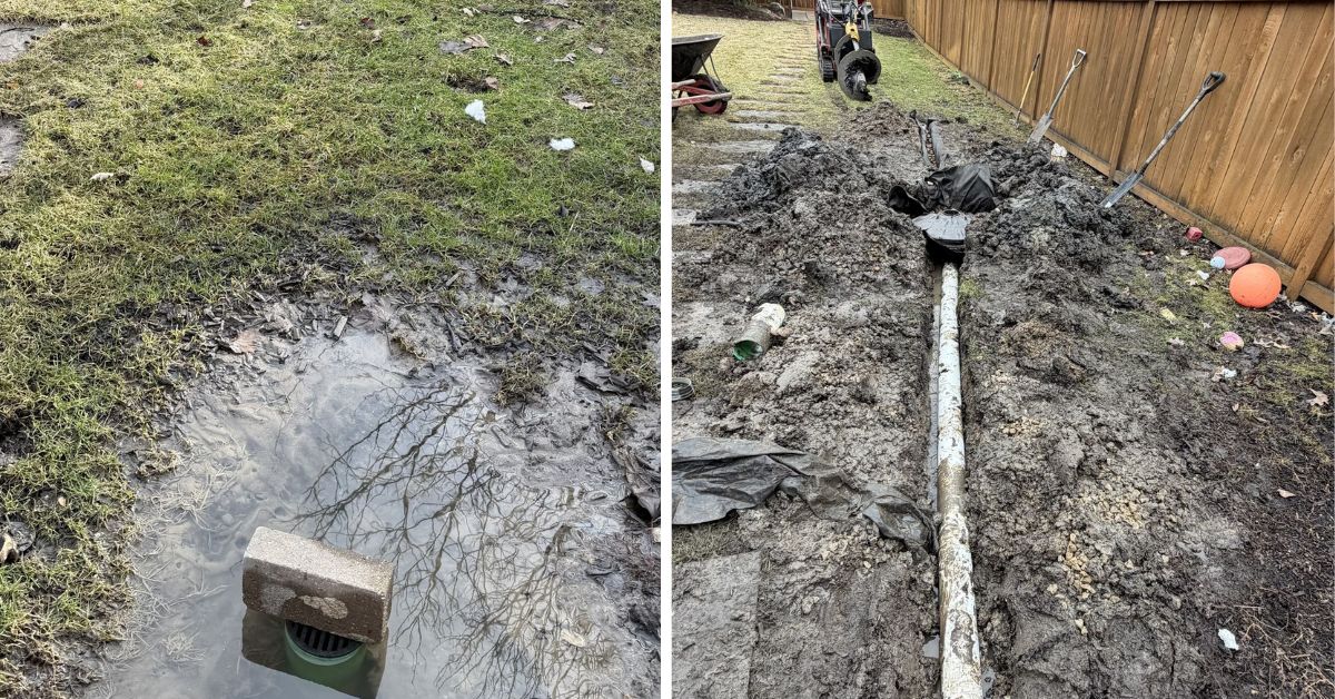 Tommy Pollina Landscape Co. Inc.’s first drainage project of the season took place at a residential property in Park Ridge, Illinois, where a previously installed PVC drainage system had failed to solve ongoing flooding issues. The existing system terminated in a simple T-fitting just below the surface with no proper discharge point, leaving water with nowhere to go. Even snowmelt, not a major storm, caused severe water accumulation near the home’s foundation. After a full evaluation, we determined the issue was not just the pipe itself, but improper grading and the lack of a properly engineered discharge solution.