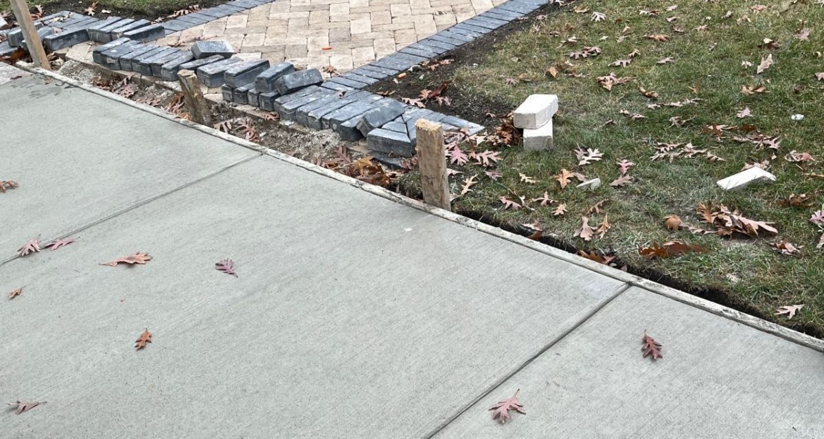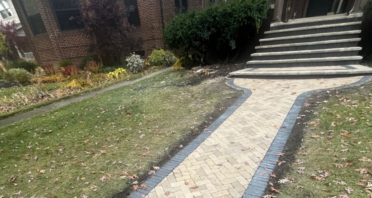 Final work includes clean transitions where the new Unilock walkway meets the newly paved sidewalk, with railings, pilasters, and columns to follow, completing a restored, functional, and visually striking front entry built to last.